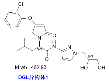 | 英文名称 | (R)-2-(4-(2-chlorophenoxy)-2-oxo-2,5-dihydro-1H-pyrrol-1-yl)-N-(1-((R)-2,3-dihydroxypropyl)-1H-pyrazol-3-yl)-4-methylpentanamide | 产品简称 | DGLATDYYGT01 |